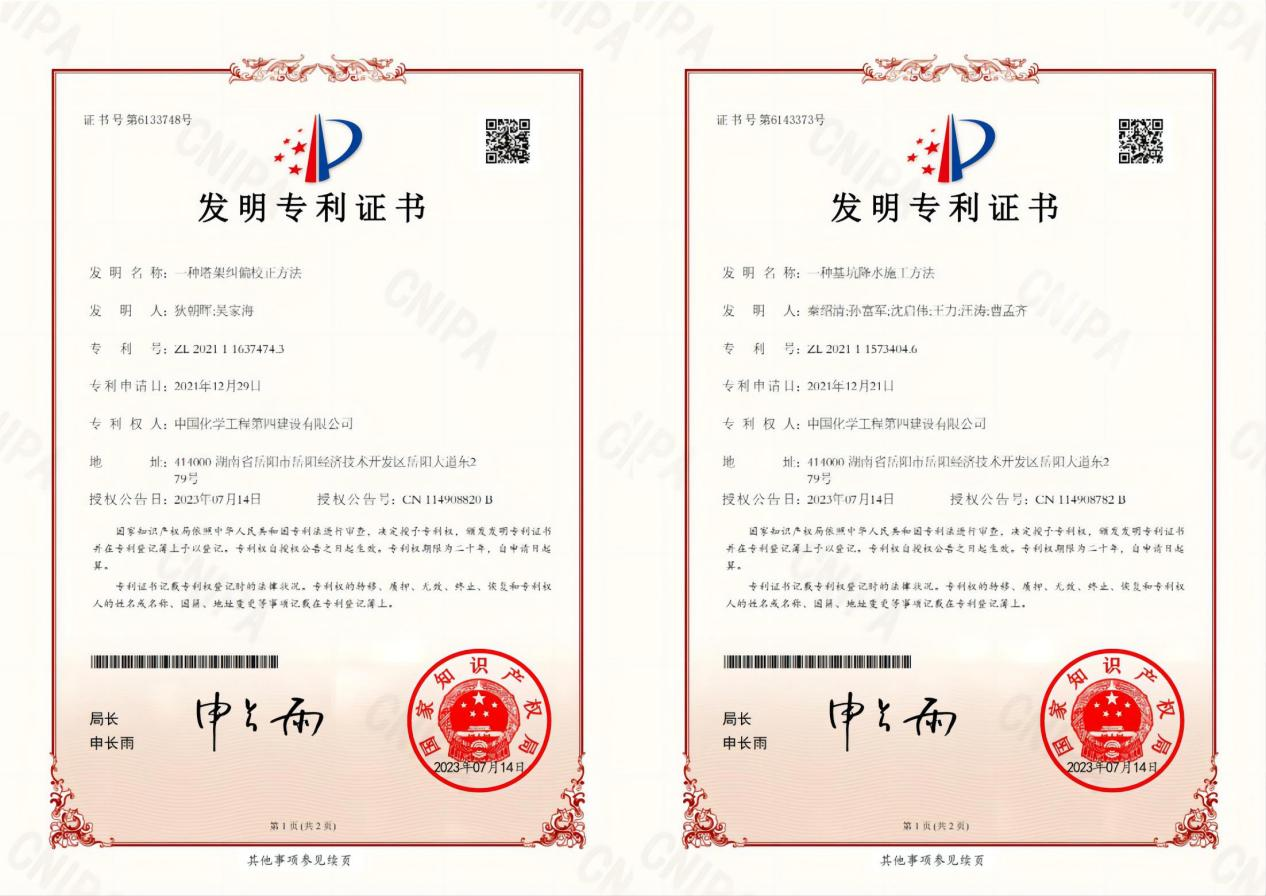 近日,從國家知識產(chǎn)權(quán)局傳來喜訊,公司新獲兩項發(fā)明專利。其中專利“一種塔架糾偏校正方法”,發(fā)明人為華東公司狄朝暉、吳家海,專利號ZL202111637474.3;專利“一種基坑降水施工方法”,發(fā)明人為華東公司秦紹清、孫富軍、沈啟偉、王力、汪濤、曹孟齊,專利號ZL202111573404.6。