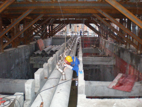 針對作業面在地下負二層,光線較差、通風不暢,同時土建單位正在拆除臨時支撐,施工現場工作環境相當惡劣等情況。為保證現場施工正常有序的進行和施工人員身體健康,項目部采取相應措施保證了整個現場的安全、照明、通風。施工人員發揚四化建吃苦耐勞、敢打敢拼的精神,長期冒雨作業。吊裝中有吊機運行不到的地方,就積極開動腦筋,用技巧、經驗和人力,保證前期設備及管道的吊裝倒運,為后期的施工做好了良好的鋪墊。