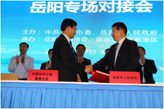 余津勃代表中國化學(xué)工程集團公司,作為第一個央企代表與岳陽市委常委、市政府常務(wù)副市長唐道明簽訂岳陽市人民政府—中國化學(xué)工程集團公司戰(zhàn)略合作框架協(xié)議。協(xié)議內(nèi)容為:岳陽市人民政府支持中國化學(xué)集團公司在岳陽市范圍內(nèi)依法合規(guī)開展化學(xué)工程項目建設(shè)、?;芫W(wǎng)改造、城市地下管網(wǎng)建設(shè)、化工管道安裝和其他市政、環(huán)保、工業(yè)廢棄場地處理等項目建設(shè),并在項目前期調(diào)研、項目實施提供支持并營造好的環(huán)境,協(xié)調(diào)在岳項目地履行合同辦理所涉及各項行政審批義務(wù)。中國化學(xué)集團公司協(xié)調(diào)所屬工程公司、基金公司、財務(wù)公司在岳陽市區(qū)域內(nèi)完成項目投資和投融資支持。2016年首批啟動“四化建商業(yè)綜合體建設(shè)工程”等項目。