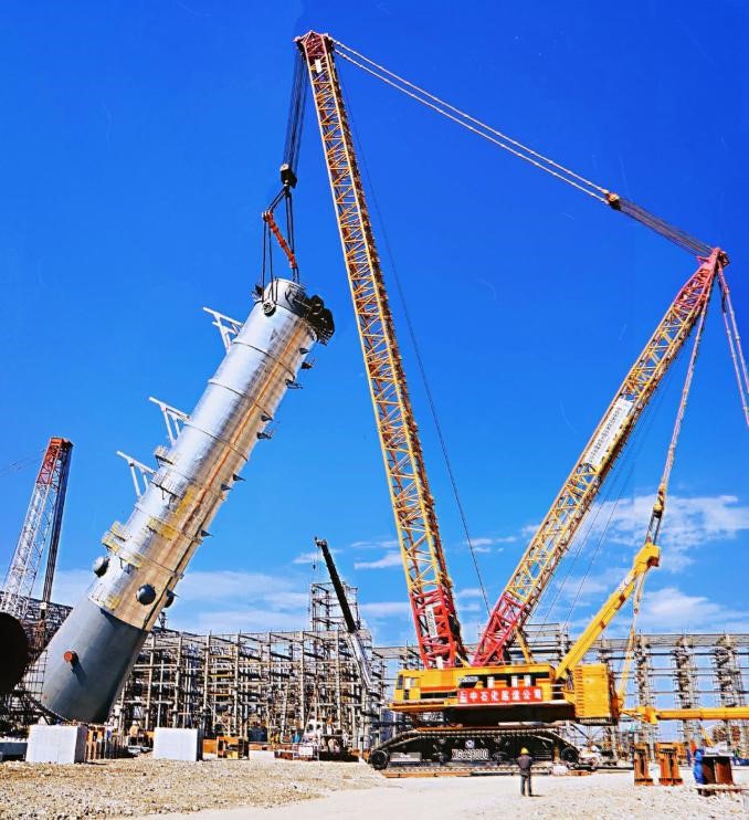 自今年9月20日以來, 苯乙烯項目部共成功吊裝第一脫氫換熱器、三聯(lián)換熱器、轉(zhuǎn)烷基化反應(yīng)器、苯處理器、多乙苯塔、苯/甲苯塔等大型設(shè)備13臺,吊裝總噸位約達2000噸。其中,最重設(shè)備三聯(lián)換熱器重687噸,高41米,最大吊裝高度63米;而這次吊裝的低壓粗苯乙烯塔,塔體總高度92.2米,重量950噸,是整個大型設(shè)備吊裝中最復(fù)雜的設(shè)備之一,分兩段運至施工現(xiàn)場,由2000噸吊車吊起來空中組對、焊接。