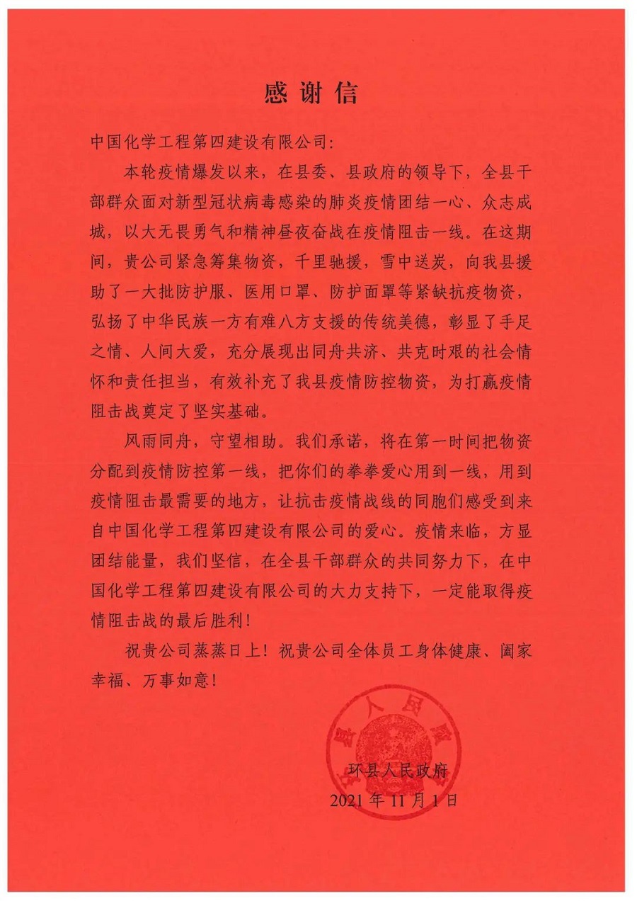 11月1日,公司收到甘肅省環(huán)縣人民政府向公司發(fā)來的感謝信。信中對公司向環(huán)縣進(jìn)行抗疫物資捐贈的愛心舉動表示衷心感謝,并稱在這個特殊時期,公司主動參與環(huán)縣的疫情防控,用拳拳愛心凝聚正能量,以殷殷真情共筑防控網(wǎng),既體現(xiàn)了大國央企的責(zé)任擔(dān)當(dāng),更加深了中國化學(xué)與環(huán)縣的手足之誼。