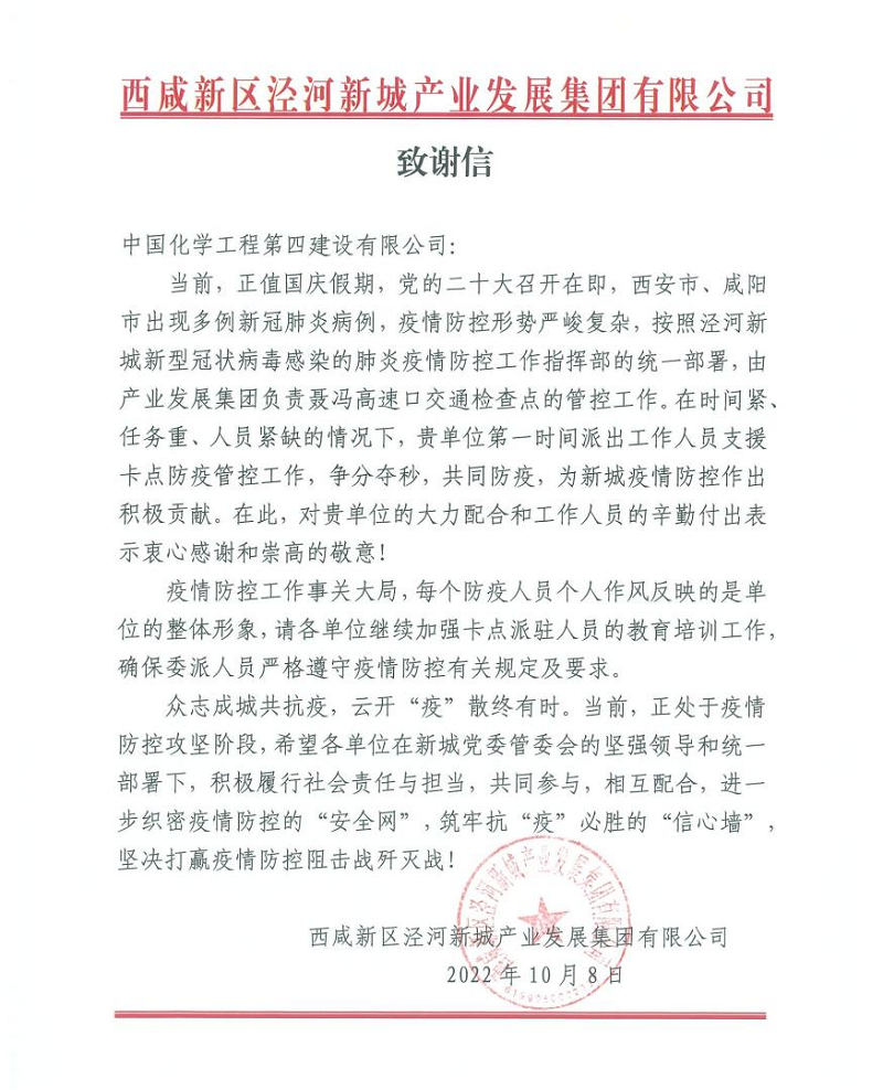 10月9日,陜西西咸新區涇河新城產業發展集團有限公司向公司發來了致謝信,信中對西部公司泊灣中心項目部在國慶假期、二十大召開前夕抽調人員支援西安市聶馮高速口防疫檢查的工作表示衷心感謝,對公司以實際行動助力屬地疫情防控工作給予高度贊揚。