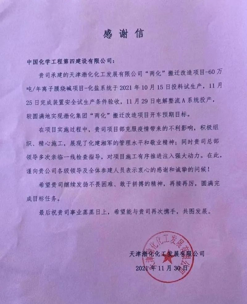 2021年11月29日,天津渤化“兩化搬遷”60萬(wàn)噸離子膜燒堿項(xiàng)目電解整流A系一次送電成功,相繼產(chǎn)出燒堿、鹽酸等合格產(chǎn)品,進(jìn)入試生產(chǎn)階段。