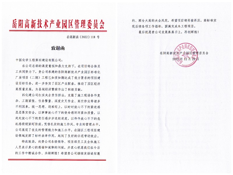 在《致謝函》中,岳陽高新技術產業園區管委會充分肯定了項目部在施工過程中,充分發揮央企的責任擔當,面對施工現場條件復雜、工期緊張、任務繁重、深度交叉作業、高空作業等諸多不利因素,憑借扎實的施工作風、專業的管理水平,保質保量地完成了各項施工作業,在園區工程項目建設領域發揮了標桿表率作用,起到了良好的示范帶動效應。同時,希望項目部再接再厲,高標準實現后續各項工作指標,圓滿完成本工程項目。(通訊員 何媛媛