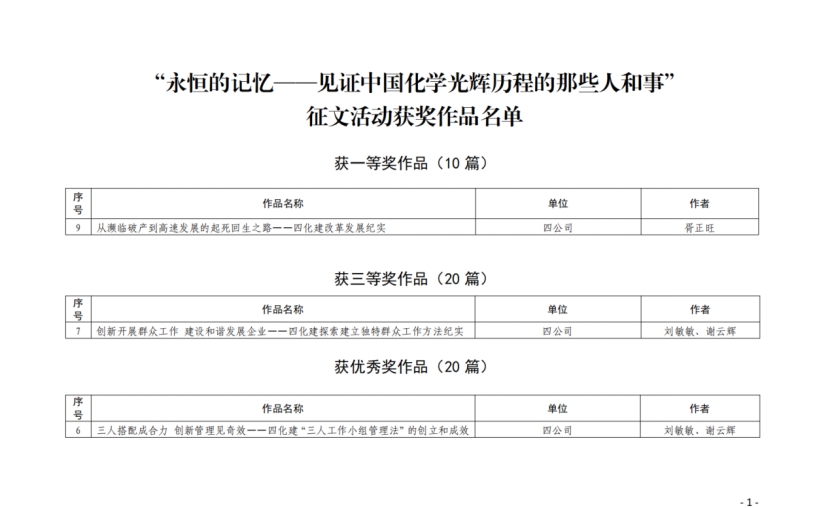 2020年3月以來(lái),集團(tuán)公司組織開展了“永恒的記憶——見證中國(guó)化學(xué)光輝歷程的那些人和事”征文活動(dòng)。該活動(dòng)得到了公司職工的積極響應(yīng),共向集團(tuán)上報(bào)8篇征文作品。其中由公司工會(huì)主席胥正旺撰寫的征文《從瀕臨破產(chǎn)到高速發(fā)展的起死回生之路——四化建改革發(fā)展紀(jì)實(shí)》榮獲一等獎(jiǎng),由公司黨群工作部主任劉敏敏、《四化建簡(jiǎn)報(bào)》執(zhí)行主編謝云輝共同撰寫的征文《創(chuàng)新開展群眾工作 建設(shè)和諧發(fā)展企業(yè)——四化建探索建立獨(dú)特群眾工作方法紀(jì)實(shí)》《三人搭配成合力 創(chuàng)新管理見奇效——四化建“三人工作小組管理法”的創(chuàng)立和成效》分別榮獲三等獎(jiǎng)和優(yōu)秀獎(jiǎng),并先后在中國(guó)化學(xué)微信公眾號(hào)和《中國(guó)化學(xué)報(bào)》刊登。