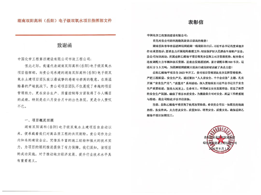 湖南雙陽高科(岳陽)電子級(jí)雙氧水項(xiàng)目指揮部在致謝函中表示,在雙氧水項(xiàng)目建設(shè)期間,面對(duì)高溫酷暑的嚴(yán)峻挑戰(zhàn),市政公司項(xiàng)目團(tuán)隊(duì)展現(xiàn)出卓越的項(xiàng)目管理能力,在安全生產(chǎn)、質(zhì)量控制、進(jìn)度管理等方面贏得了相關(guān)各方的廣泛認(rèn)可,為項(xiàng)目順利推進(jìn)作出了突出貢獻(xiàn),謹(jǐn)向公司和項(xiàng)目部全體人員表示衷心感謝。