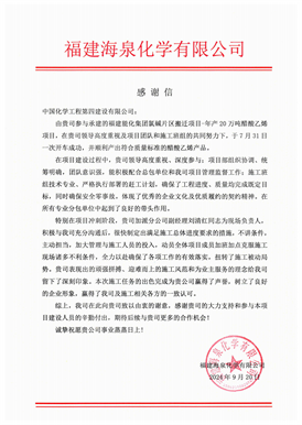 華南公司福建海泉化學(xué)醋酸乙烯項(xiàng)目收到業(yè)主感謝信