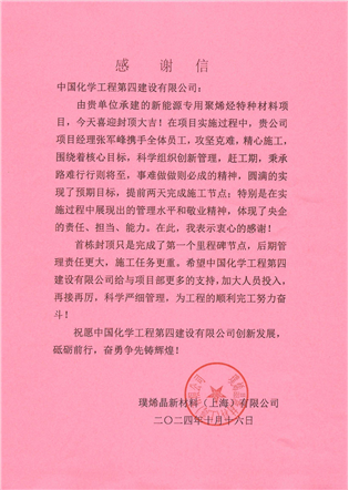 近日,璞烯晶新材料(上海)有限公司向華東公司發(fā)來感謝信,對項目團隊在璞烯晶新能源專用聚烯烴特種材料項目節(jié)點攻堅的突出表現(xiàn)予以高度贊揚和衷心感謝。