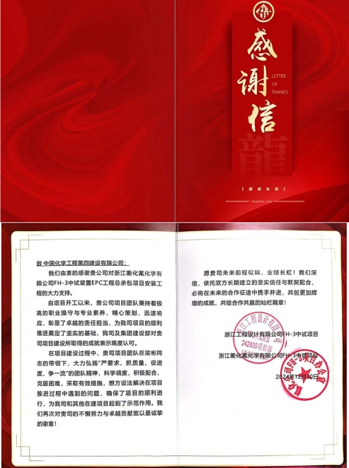 近日,華北公司收到浙江衢化氟化學(xué)有限公司及浙江工程設(shè)計有限公司發(fā)來的聯(lián)名感謝信,對衢化項(xiàng)目團(tuán)隊在項(xiàng)目建設(shè)過程中作出的積極貢獻(xiàn)表示感謝。