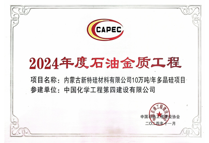 西部公司內(nèi)蒙古新特硅材料項(xiàng)目獲評2024年度石油金質(zhì)工程