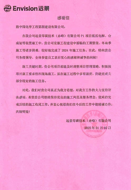 近日,東北公司收到遠(yuǎn)景零碳技術(shù)(赤峰)有限公司發(fā)來的感謝信,對東北公司安全優(yōu)質(zhì)高效完成各項(xiàng)施工任務(wù)給予高度贊揚(yáng)與衷心感謝。