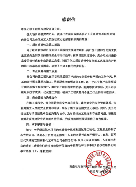 近日,建筑工程公司收到湖南雙陽高科化工有限公司岳陽分公司發(fā)來感謝信,對建筑工程公司在電子級雙氧水項(xiàng)目廠房土建施工中的突出表現(xiàn)給予高度認(rèn)可和衷心感謝。