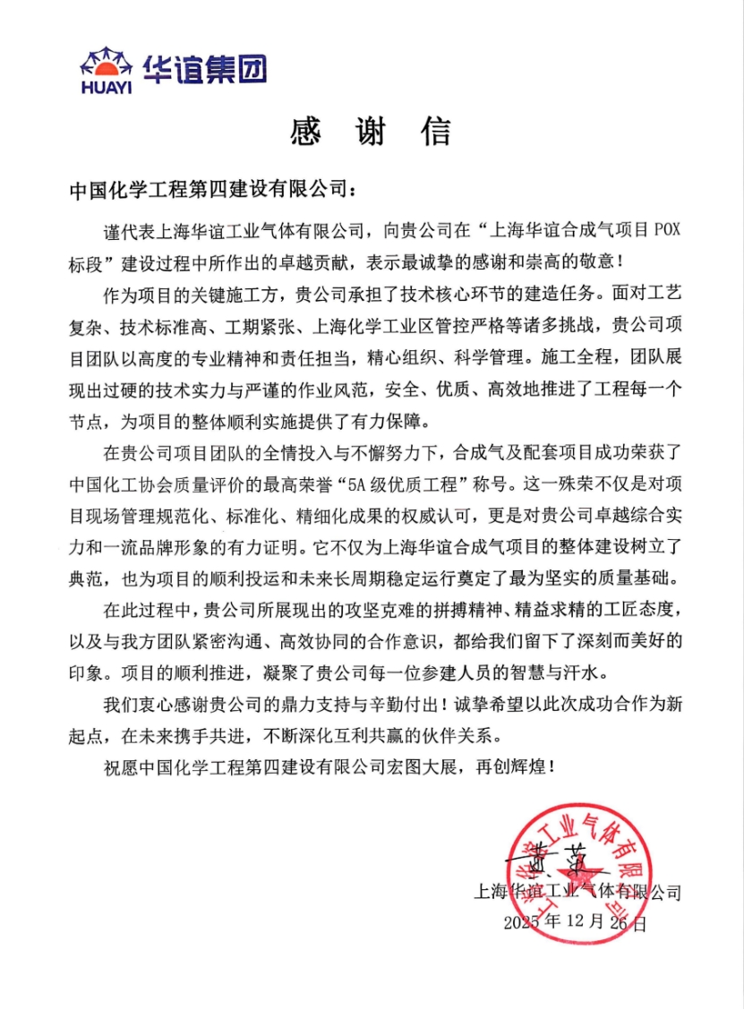 近日,華東公司收到上海華誼工業氣體有限公司發來的感謝信,對華東公司在上海華誼合成氣供應及配套項目POX標段建設過程中的專業表現與突出貢獻給予高度評價。
