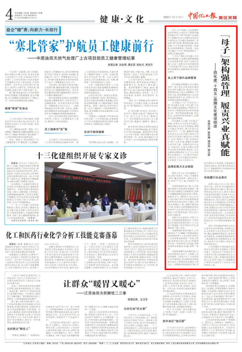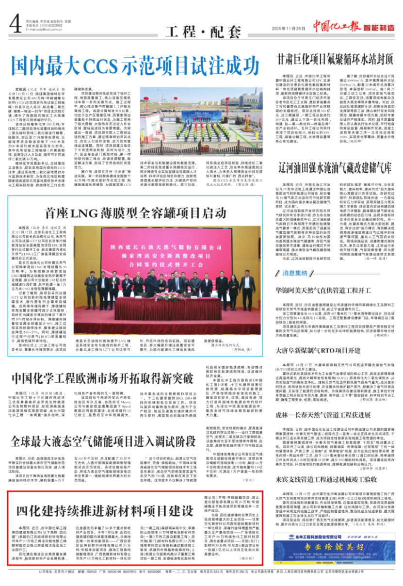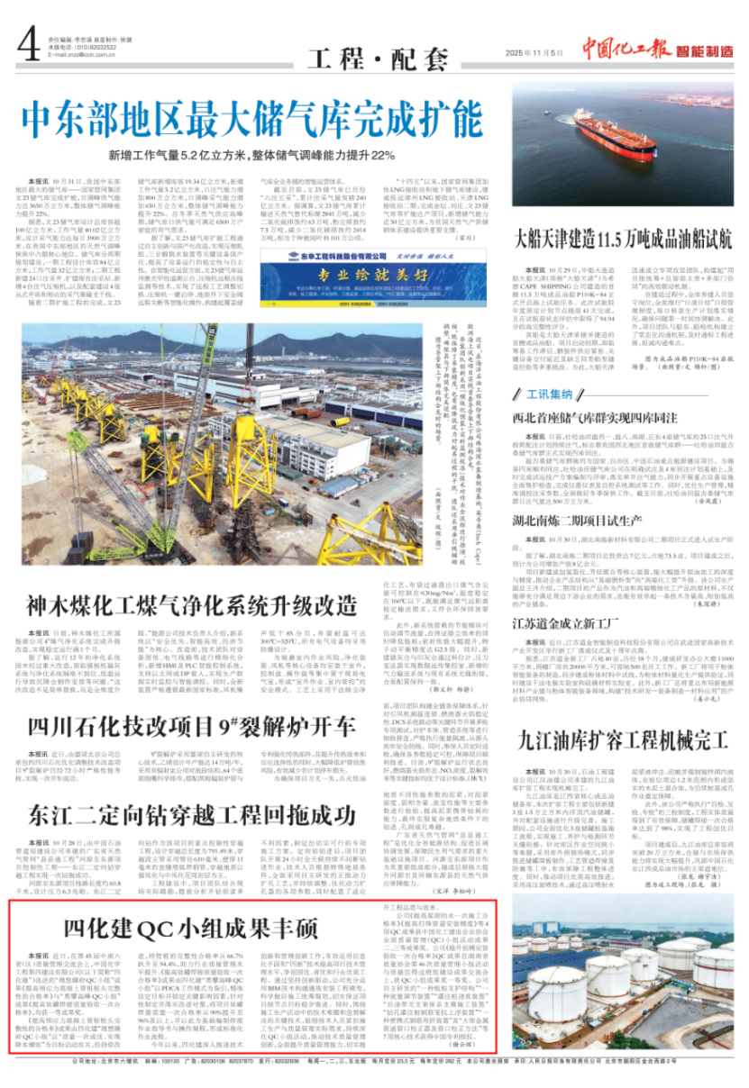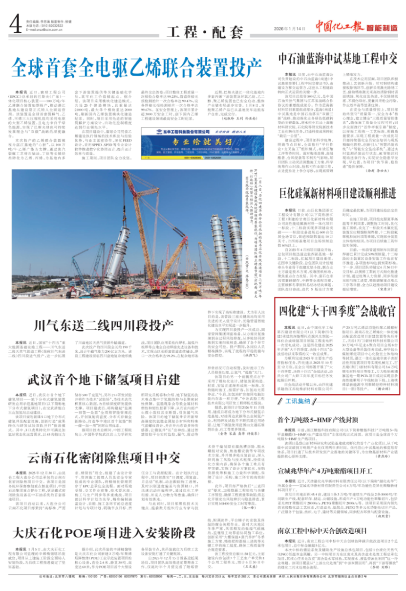 近日,中國(guó)石油和化學(xué)工業(yè)權(quán)威報(bào)紙、中國(guó)百強(qiáng)報(bào)刊——《中國(guó)化工報(bào)》連續(xù)刊發(fā)多篇報(bào)道,聚焦中國(guó)化學(xué)工程第四建設(shè)有限公司在2025年收官之際取得的系列發(fā)展成果,充分展現(xiàn)企業(yè)在新市場(chǎng)開拓、重大項(xiàng)目攻堅(jiān)、技術(shù)創(chuàng)新驅(qū)動(dòng)、品牌文化塑造及新興產(chǎn)業(yè)布局等方面的綜合實(shí)力與奮進(jìn)姿態(tài)。