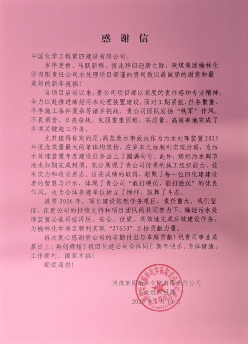 近日,建筑工程公司收到陜煤集團榆林化學有限責任公司發(fā)來的感謝信,對公司在陜煤榆林化學二期一階段項目烯烴污水處理裝置建設中的卓越表現(xiàn)與突出貢獻給予高度評價。