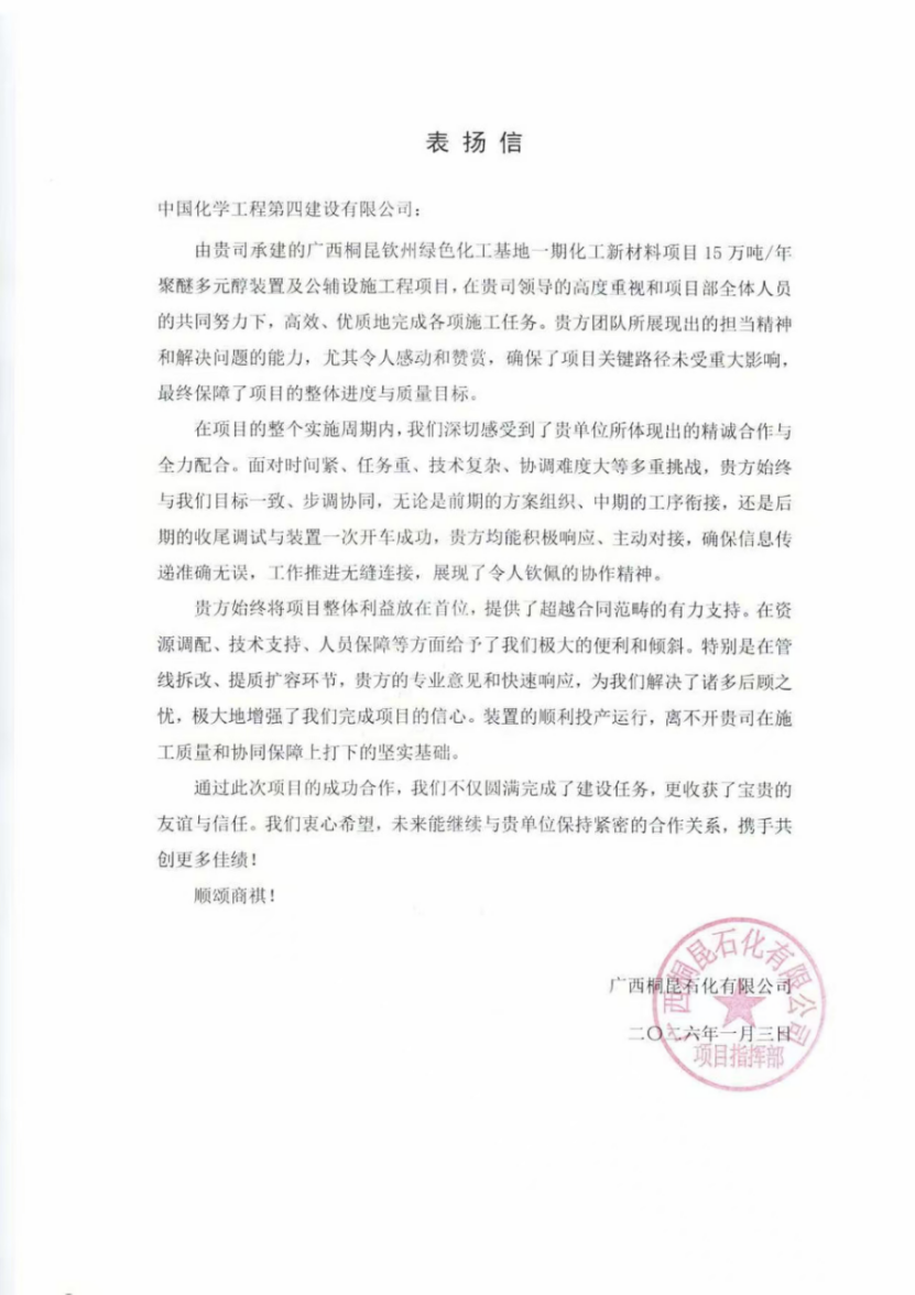 近日,華北公司收到廣西桐昆石化有限公司發(fā)來的表揚信,對華北公司在廣西桐昆欽州綠色化工基地一期化工新材料項目15萬噸/年聚醚多元醇裝置及公輔設施工程建設中的出色履約給予高度評價。