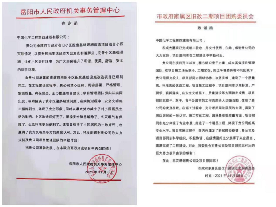近日,建筑工程分公司和成大廈項目、岳陽市政府家屬區改造項目分別收到岳陽市政府家屬區舊改二期項目團購委員會、岳陽市人民政府機關事務管理中心送來的兩封致謝函。