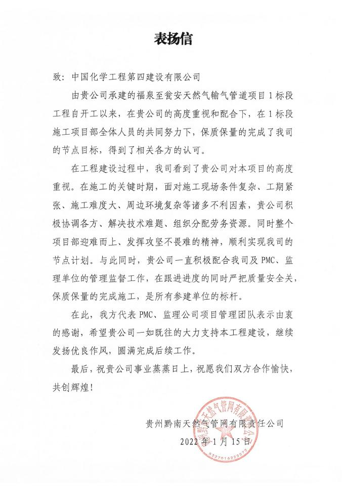 1月19日,由西部分公司承建的福泉至甕安天然氣管道項目收到貴州黔南天然氣管網有限公司發來的表揚信。